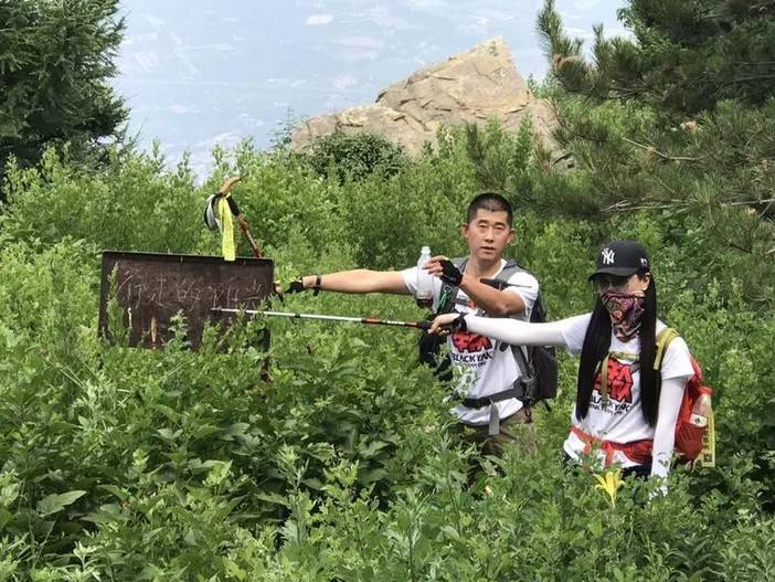 无极领队在每个岔路口都留下了路标,东风雨不时确认队首及队尾的进程。眼看着快要登顶第二座山峰时,我和先生按照路标继续攀爬,并告知后面老孟和晓雪岔路口走左面。可能晓雪腿疼得有点坚持不住了,我听到老孟对讲机里与无极确认下山路线,适时在岔路口选择了另外一条平坦的小路直通山脚的公交车站。我关心地问了下先生的身体状况,言外之意不行的话我们也选择另外一条路,他表示没问题,于是我们信心满满地累并坚持着!已经听到前面队伍登顶的喜报,及晓雪与老孟视线所及看到山脚公路的喜悦,等我跟先生赶到山顶与无极领队汇合时,前行队友们已在陆续吃着冰棍喝着啤酒了。听到大雄在对讲机里喊我快去吃冰棍,我们在山顶没有过多逗留,十多分钟就随无极领队,赶往山脚商店与大部队集合,大雄远远就挥动着手里的冰棍,后来我才知道弟弟买时就只有这一根儿冰棍了,他没舍得吃给我留着,我一边贪心地吃着冰棍一边喝着冰爽的北冰洋,并备够了后面行程的水。