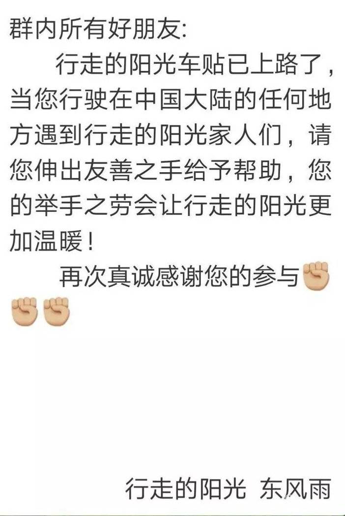 【行走的阳光】是一支讲团结、讲友谊、讲互助、讲和谐的友好大家庭。为了在路上随时能够相遇相识,为了队友间有福同享,有难同当,特设计制作了【行走的阳光】标识。该标识由【行走的阳光】创始人东风雨授予团员做为车贴贴于车的后窗。