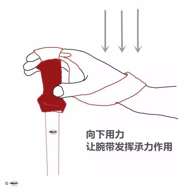 腕带穿戴——使用者应将手从腕带的下方穿过,然后腕带与登山杖结合的顶端握在手中,抓住登山杖的把手,这样腕带就能托举你的手部。