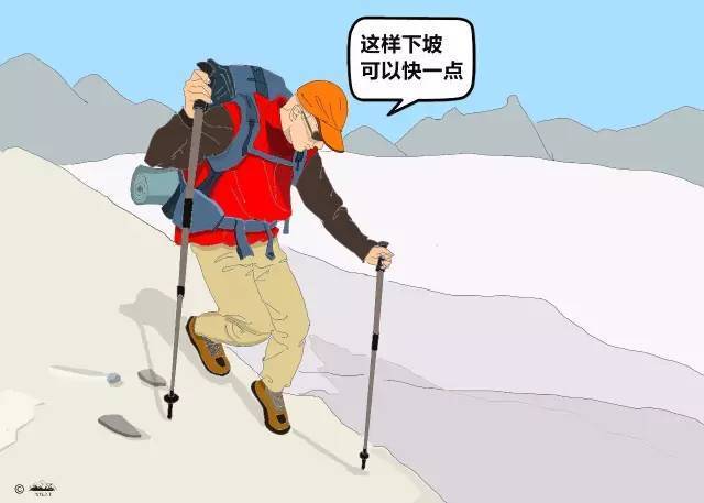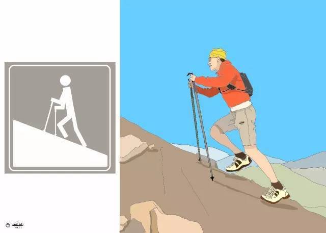 陡路双杖齐出——当使用者在陡峭的斜坡上爬升或下行时,同时将一对登山杖落地,为身体增加两个支点,这样更利于稳定身躯。
