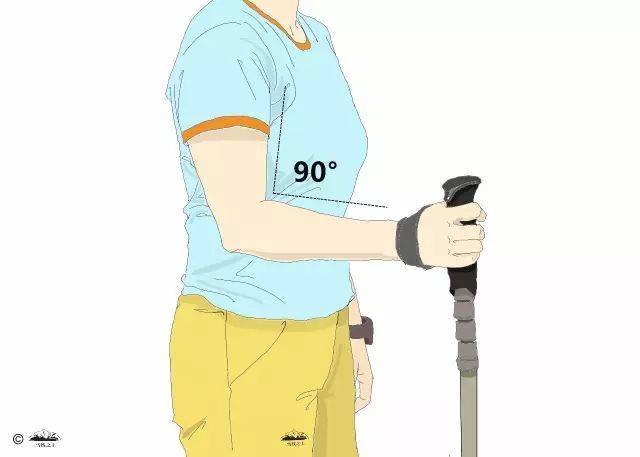 平地90°原则——在平地上来说,使用者应双臂自然下垂,然后将前臂抬起与上臂成90°,手握的登山杖正好触及地面,这就是登山杖的最佳长度。