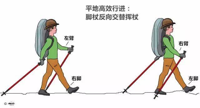 平路脚杖反向——最自然的登山杖使用方式,如四脚动物一般行走,杖与手交错前进。