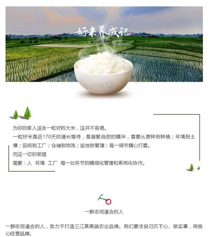 三江昊大米,从源头做起。“助耕者谋利、为食者造福、与合作者共赢”。三江昊米业秉承营养健康、绿色安全的研发理念,集生态稻米种植、生产、销售、农业观光旅游于一体的大型现代化企业。
