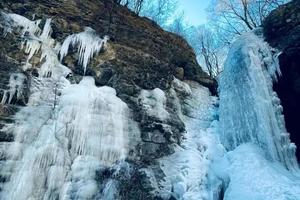 往日流水潺潺的河溪,凝结成洁白的“玉带”在山涧舞动。悬挂在崖壁之上,山谷之下,一派琼妆玉砌,凝固成冰瀑,冰床,冰梯,冰花,冰凌,闪着银光,似乎把人带进了瑶池仙境。这酷似晶莹剔透的童话世界,是老天赐给我们的冬日最美好的礼物。