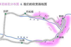 林芝市 - 30km - 尼洋河风光 - 38km - 伍巴村桃花 - 15km - 巴河镇中餐 - 36km - 巴松措景区 - 结巴村;