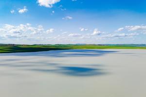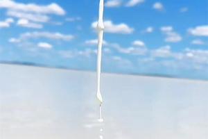 ▶湖底碳酸钙等矿物颗粒悬浮形成的“牛奶玉盘”;