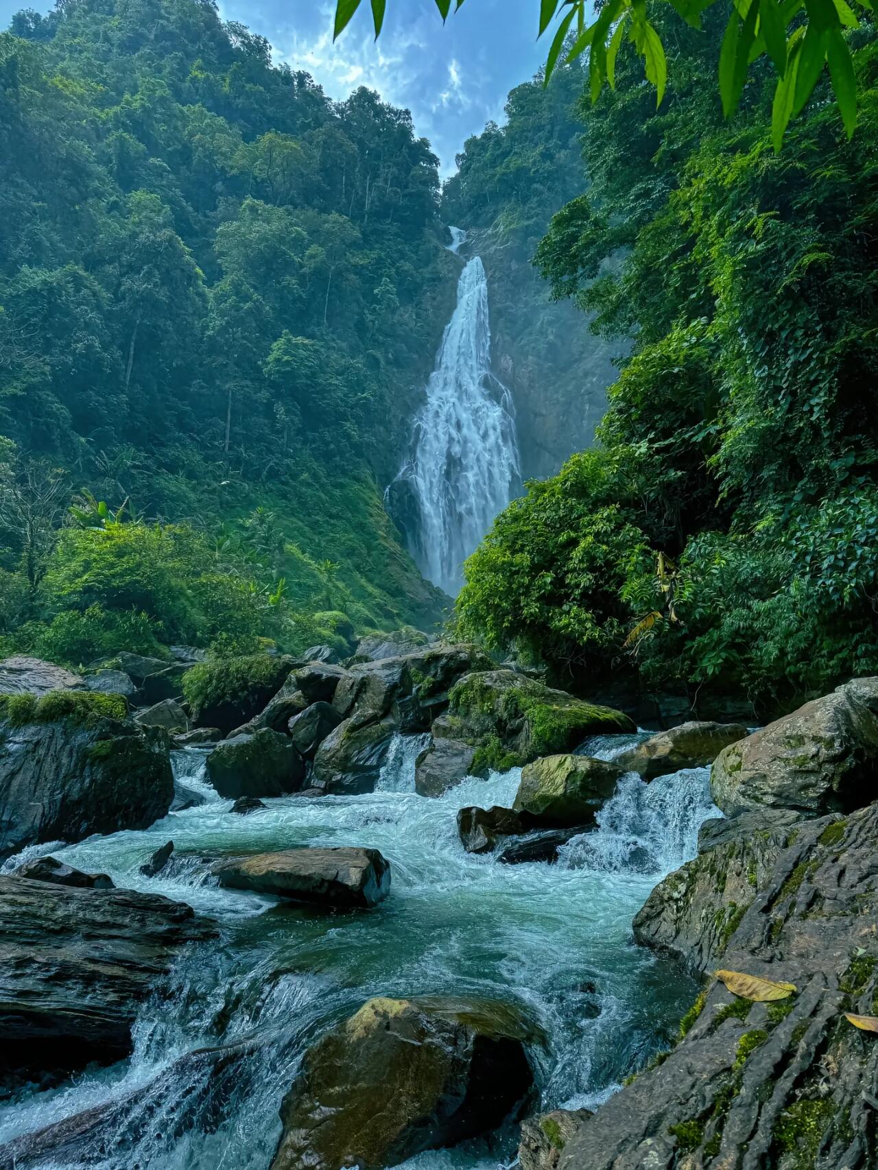 南恩瀑布是一个气势磅礴的大瀑布。河水从高处奔腾而下,如银河落九天,溅起层层水雾。瀑布的落差较大,水流湍急,发出震耳欲聋的轰鸣声。在阳光的照耀下,常常能看到美丽的彩虹横跨在瀑布之上,为这壮观的景象增添了一抹绚丽的色彩。周围的山体郁郁葱葱,绿树成荫,与白色的瀑布形成鲜明的对比。山上的植被丰富多样,有高大的乔木、茂密的灌木和各种奇花异草,构成了一幅美丽的自然画卷