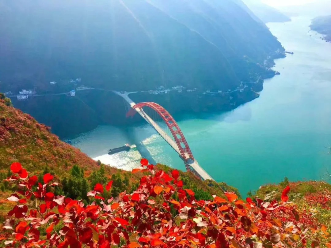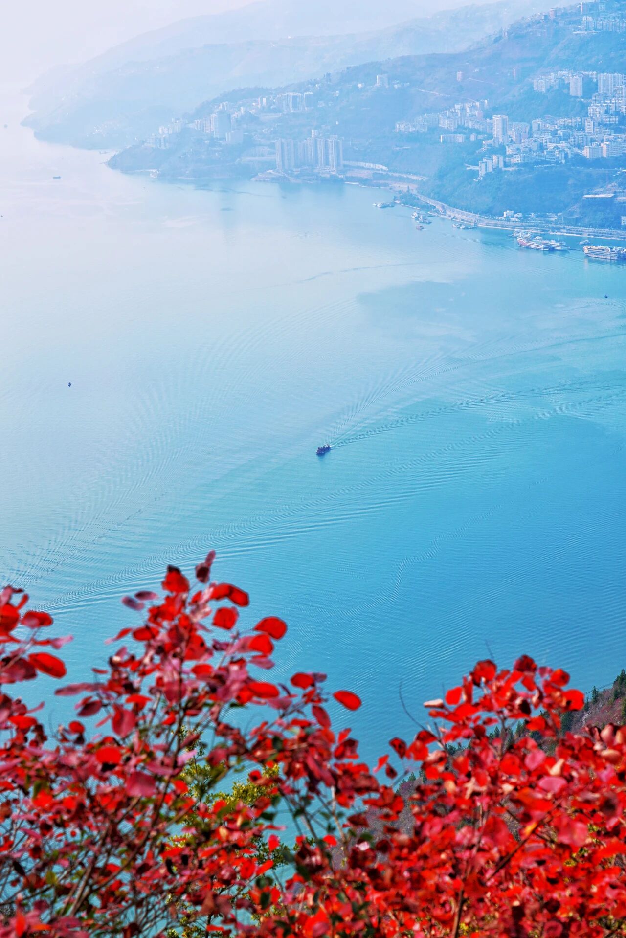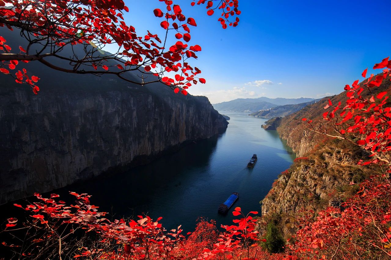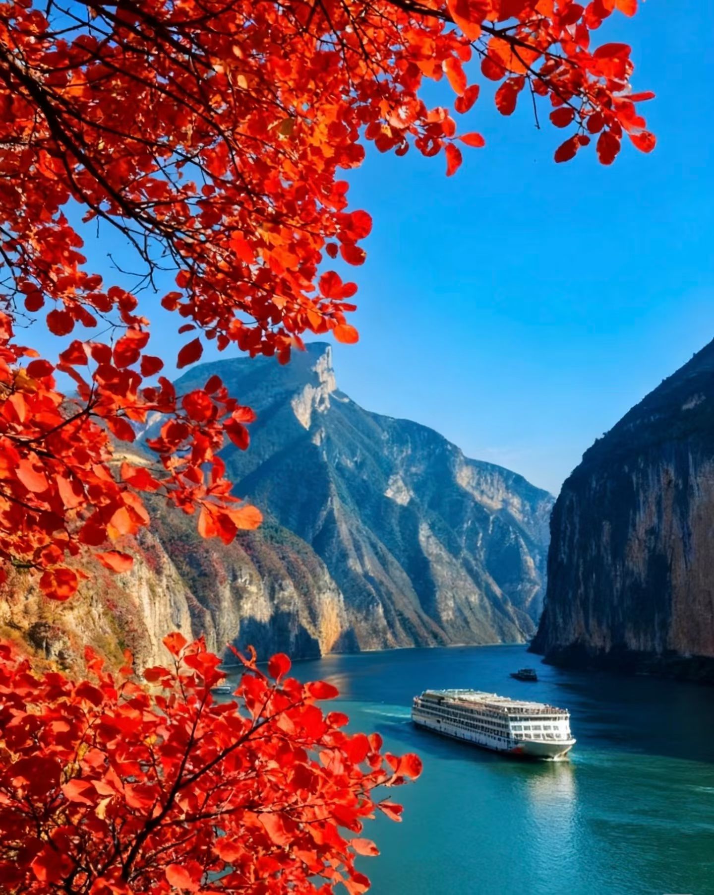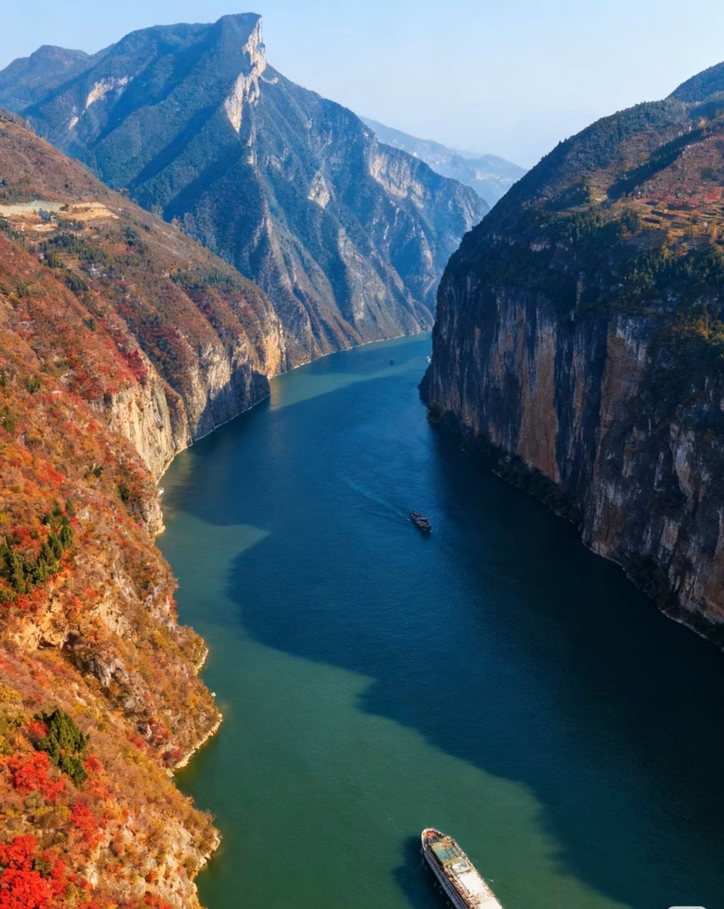 十一月的三峡,是一幅被时光浸染的立体画卷。抬头望,乌桕、黄栌、枫香交织成层叠的红色云霞,从浅绛到朱砂,从橙红到胭脂,每一片叶子都像是被夕阳吻过的火焰,在青灰色的岩壁上跳跃、闪烁。低头看,碧玉般的江水蜿蜒穿过黛色山峦,波光中倒映着红叶的剪影,宛如一条流动的翡翠丝带,将两岸的炽烈与山间的清冷温柔缠绕。行走其间,每一步都踏在千年水墨的韵律上——时而穿过悬空栈道的惊心动魄,时而驻足观景台的静谧凝望,仿佛能听见历史的风声在红叶间低语,看见诗人的笔墨在岩壁上流淌。