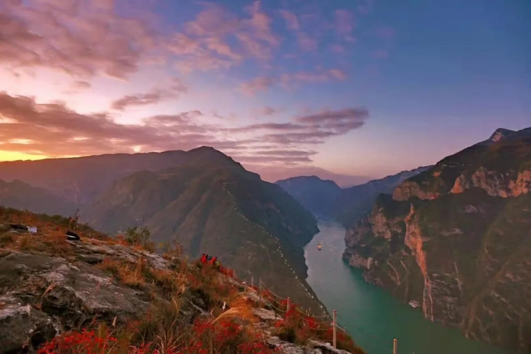 而这条徒步之路,更是一场穿越时空的对话。沿着白帝城斑驳的石阶向上,指尖触碰的不仅是冰凉的岩壁,更是1200年前李白笔下“朝辞白帝彩云间”的诗意;站在夔门悬空玻璃栈道上,脚下是万丈深渊,眼前是长江劈开群山的壮阔,仿佛能听见三国战船的号角穿越时空而来;当夜幕降临,宿在巫山脚下的吊脚楼里,江涛声伴着红叶的私语入梦,让人分不清是身处现实,还是走进了某幅古老的画卷。
