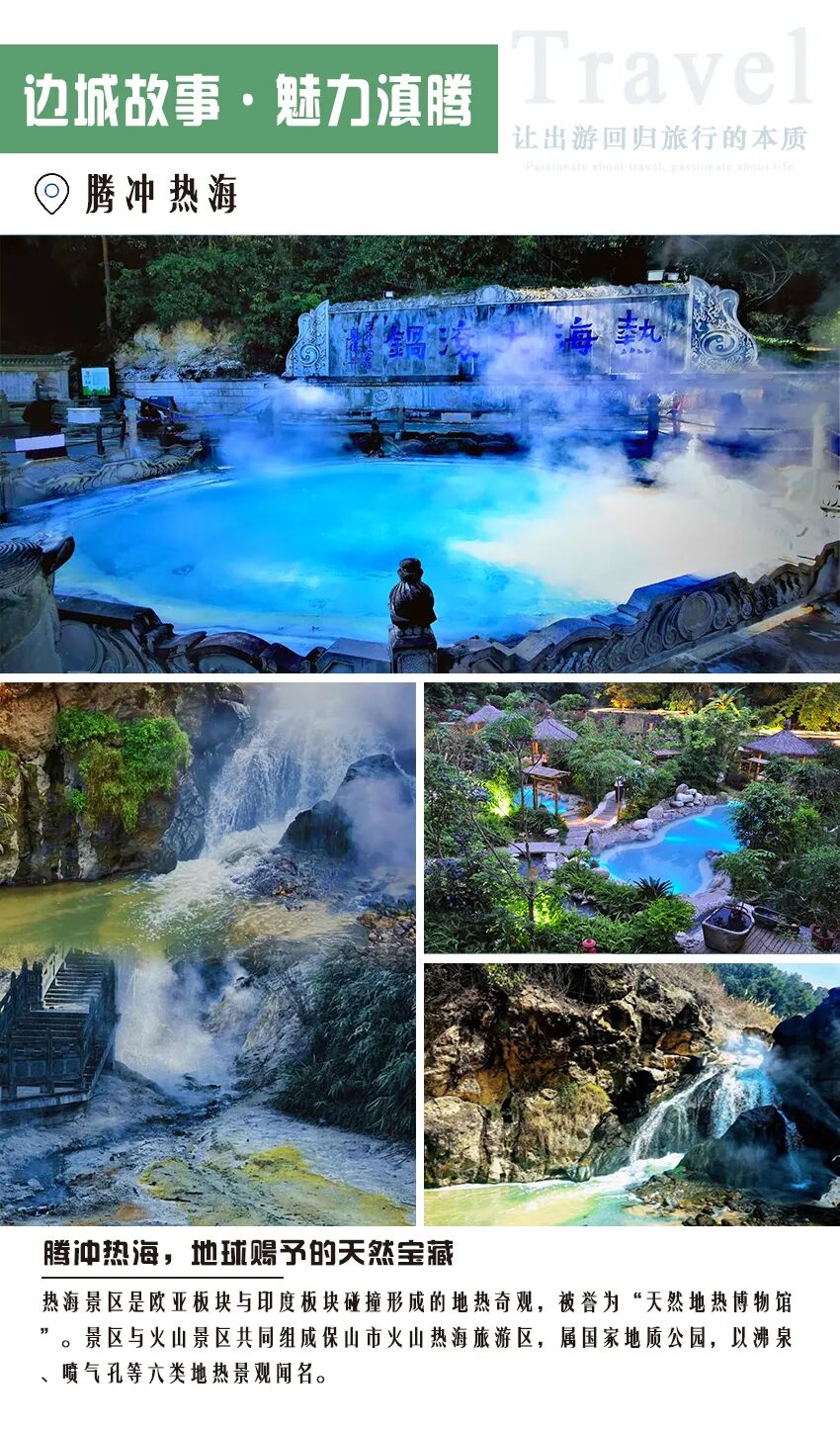 早餐后出发前往【云龙太极图观景台】。云龙“太极图”是云龙县城北处的天然地貌景观,由沘江在庄坪坝子与连井坪坝子间绕出“S”型河道,经第四纪新构造运动深切形成,从沘江西面山中或高空俯瞰形似道家太极图案。其北侧庄坪后山形似狮头,南侧连井坪后山状如象鼻,形成“狮象把门”景观,夏秋季节江水呈红丝带镶边,两岸鱼形坝子覆盖绿植如绿丝毯。该地貌东侧诺邓河汇入形成“太极锁水”景观,周边群山与诺邓玉皇阁、虎头山三清殿构成道教文化呼应。之后出发前往腾冲,途径【龙江特大桥】。龙江特大桥,位于云南省西部、横断山脉南段,龙江中游河段,跨越保山市龙陵县龙江乡上邦焕村与腾冲市五合乡大丙弄村之间的龙川江河谷,为单跨简支钢箱梁悬索桥,是保山-腾冲高速公路控制性工程。到达【腾冲热海景区】,景区由火山景区和热海景区组成,海拔1520米左右,面积约9平方千米。火山景区是中国内地四大火山群之一。腾冲处于欧亚板块与印支板块冲撞带附近,地下岩浆活动强烈,地下7至25千米深度仍存在两个直径10至30千米的岩浆囊,由于近南北向断裂系统十分发育,岩浆囊的热能源源不断在此释放,形成了腾冲地热。最后入住腾冲市。