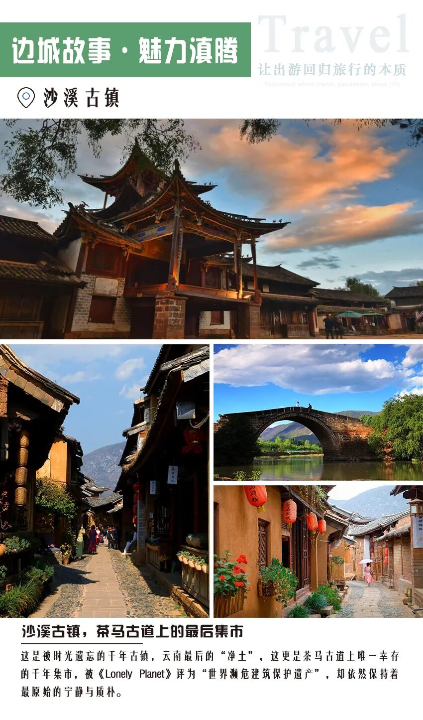 早餐后出发前往【沙溪古镇】。如果想有一趟说走就走的旅行,就来大理沙溪古镇吧。唐宋时期是南诏、大理国兴盛之时,沙溪当时就是西南地区交通要冲。而因为沙溪周围多盐井,其也是盐马古道上的中心集市,加上还是茶马古道上重要的市集,沙溪一直书写着属于马帮文化的传奇,直到民国末期。解放后,随着滇藏公路的开通,这里渐渐被遗忘,但传统建筑文化倒得以很好地保存了,比如古戏台、古寨门、古寺庙等。适时出发前往【诺邓古村】。这里是一座千年白族村寨,位于深山谷地。该村自唐代沿用现名未改,保留三四百户依山而建的明清传统民居,分布有龙王庙、玉皇阁等古庙宇及滇西最大古木牌坊,村落至今保持着养马传统,户均马匹饲养延续着古代马帮文化脉络。村内现存树龄达800余年的古黄连木,盐井遗址与古宗坪(藏族马帮驻地)、回民坪(回族牛帮集散地)等盐马古道遗迹印证着其南诏时期形成的规模化盐业历史。