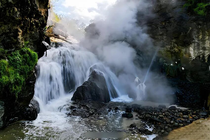 莫里瀑布,又称扎朵瀑布,位于莫里峡谷热带雨林深处。瀑布高60米,是滇西南地区落差最大的瀑布,水流自崖顶倾泻形成“叠水如棉”奇观,下方伴有温泉涌出。其名“扎朵”源于巴利语,相传释迦牟尼曾在此留下佛脚印,故被视为佛教文化圣地。瀑布所在的莫里热带雨林景区为国家级4A景区,森林覆盖率超96%,分布有大叶榕、绞杀树、树蕨等珍稀植物及孔雀等野生动物。扎朵河贯穿雨林,沿途可见佛脚印、温泉圣水等人文遗迹,形成自然生态与佛教文化交融的景观体系。