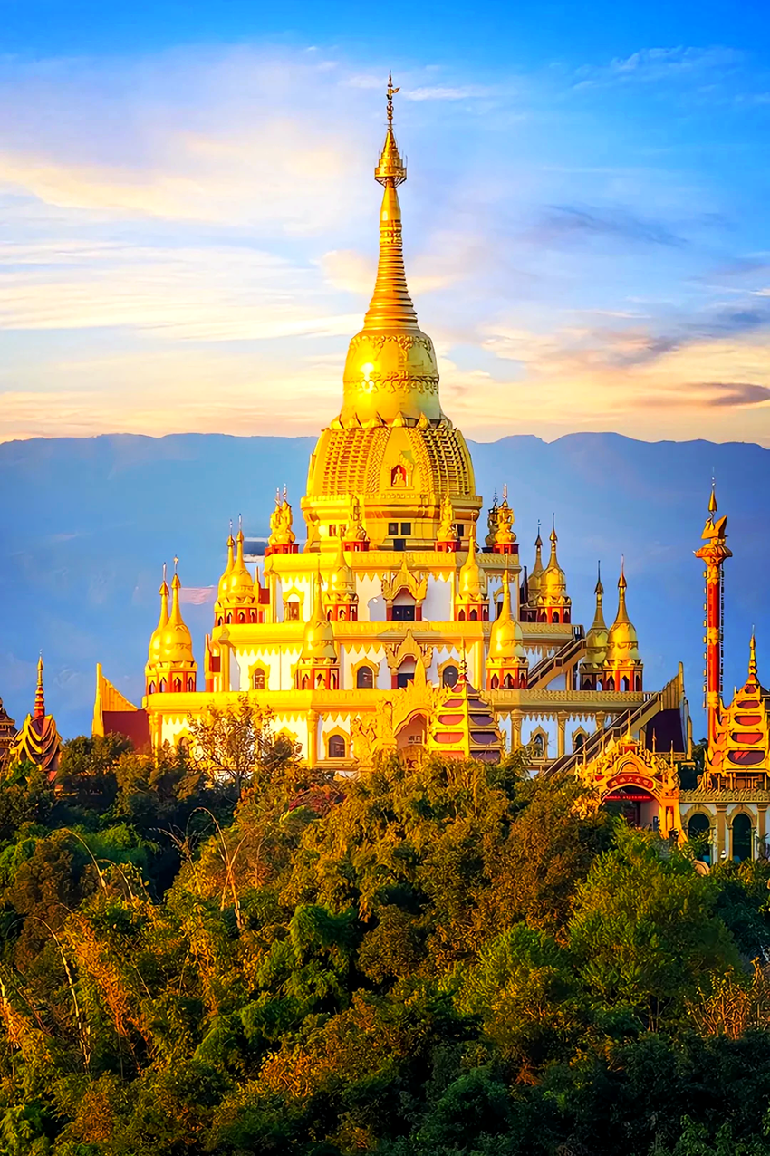 瑞丽总佛寺坐落在瑞丽江北岸的山坡上,与缅甸隔江相望。总佛寺,傣语称为“洼巴洁”,相传是公元七世纪中叶从缅甸来弘法的两位南传佛教僧人,在西双版纳与德宏两地分别兴建佛寺,历史悠久,法缘深厚。总佛寺,为境内最高等级的佛寺,负责发布全境性佛事活动。总佛寺建筑,融合了傣族传统建筑艺术与佛教元素,色彩鲜艳,装饰华丽。