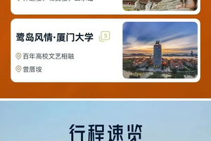 备注:厦门大学由于校规政策原因,不允许导游进入校区进行讲解,到时候进入校区导游不会打导游旗,会在大家的前面进行带路或者让大家分组进行自由游览参观,我们会给大家提供厦门大学游览攻略图,到时候厦门大学由于政策原因不可进入,会给大家替换成厦大翔安校区或者集美大学