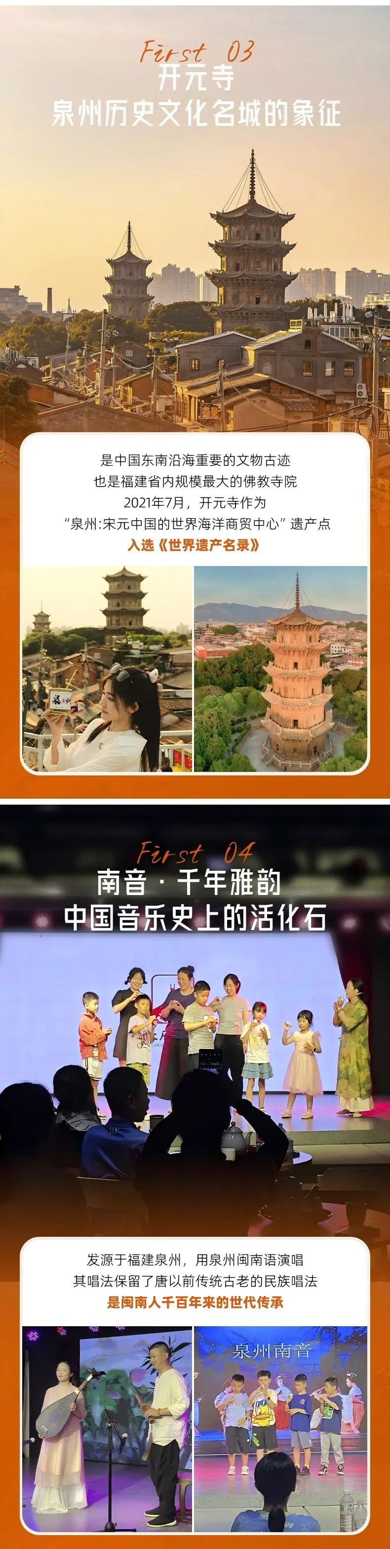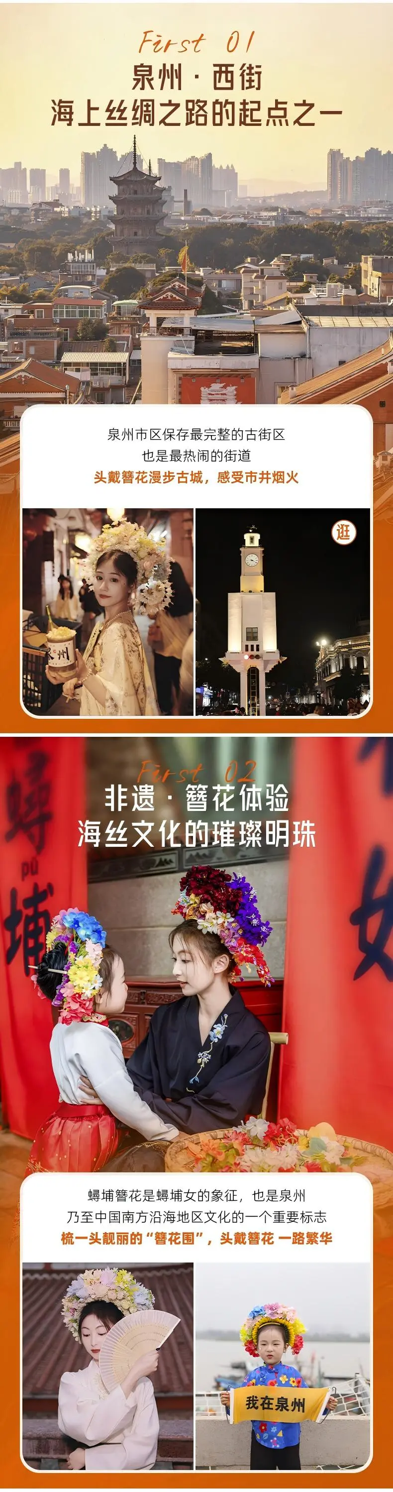 在西街可体验【簪花围】,蟳埔女与惠安女、湄州女并称福建三大渔女,蟳埔簪花是重要文化标志。自由觅食后,前往观赏【南音木偶戏】。南音是中国现存最悠久的汉族古乐,被誉为“中国音乐史上的活化石”;泉州提线木偶戏历史可追溯到西汉,是当地民间信仰和民俗活动的重要部分。
