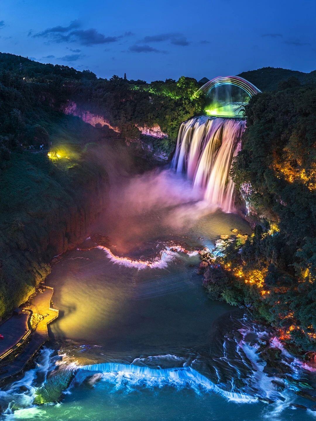 瀑布不再是白日的银白,而是被紫粉蓝调晕染整片山谷,成为一块巨大的天然幕布。光影在其上勾勒出横跨水帘的彩虹,激光投影布依族图腾,水雾间浮动的光粒子如星河倾泻。