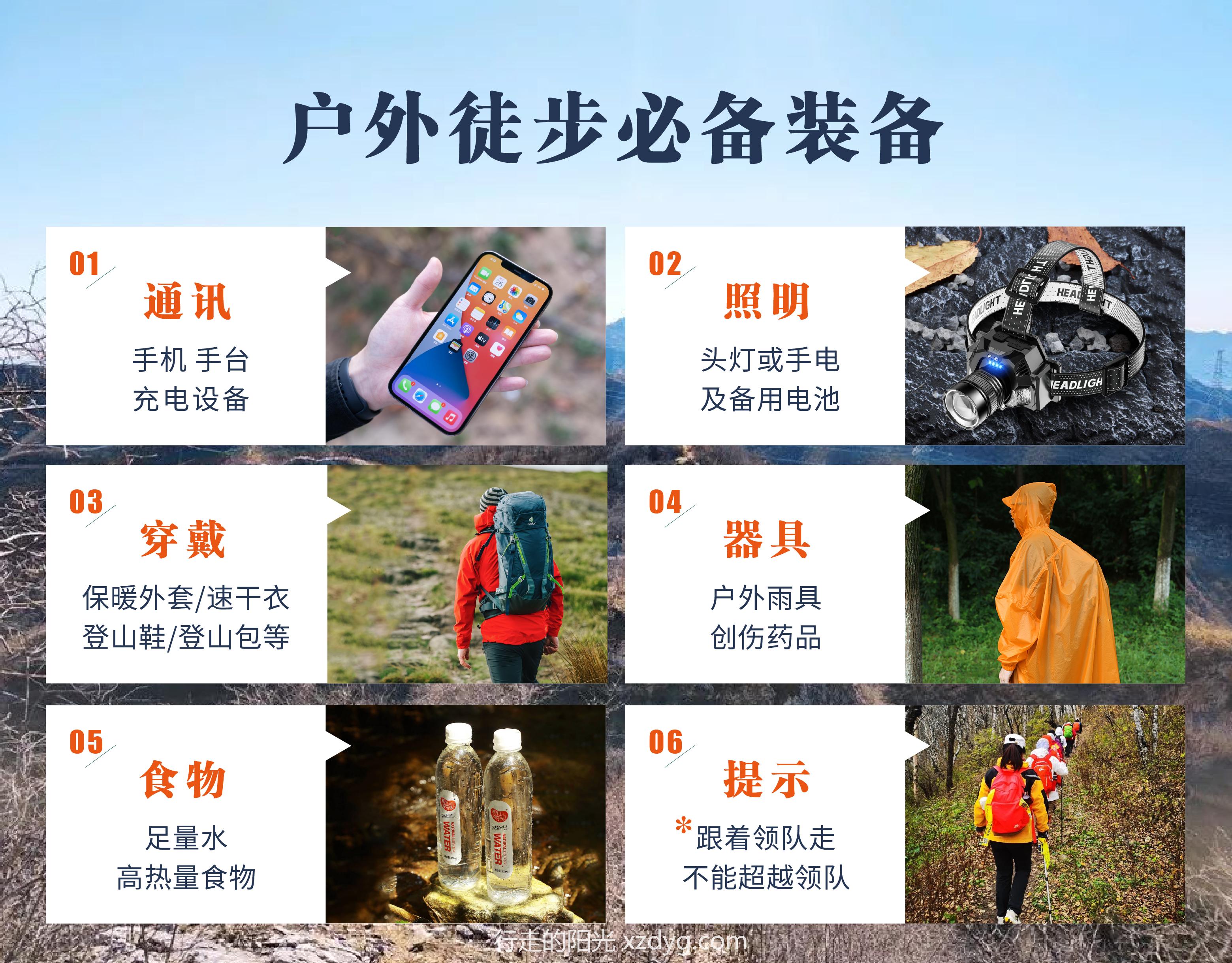 2、强制装备:保暖衣物(冲锋衣+抓绒衣或羽绒服)、速干衣裤、雨衣(常备)、登山徒步鞋、小型双肩背包、身份证;