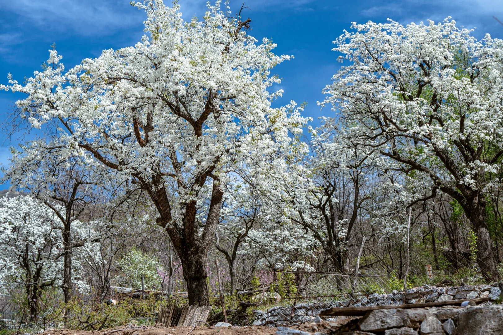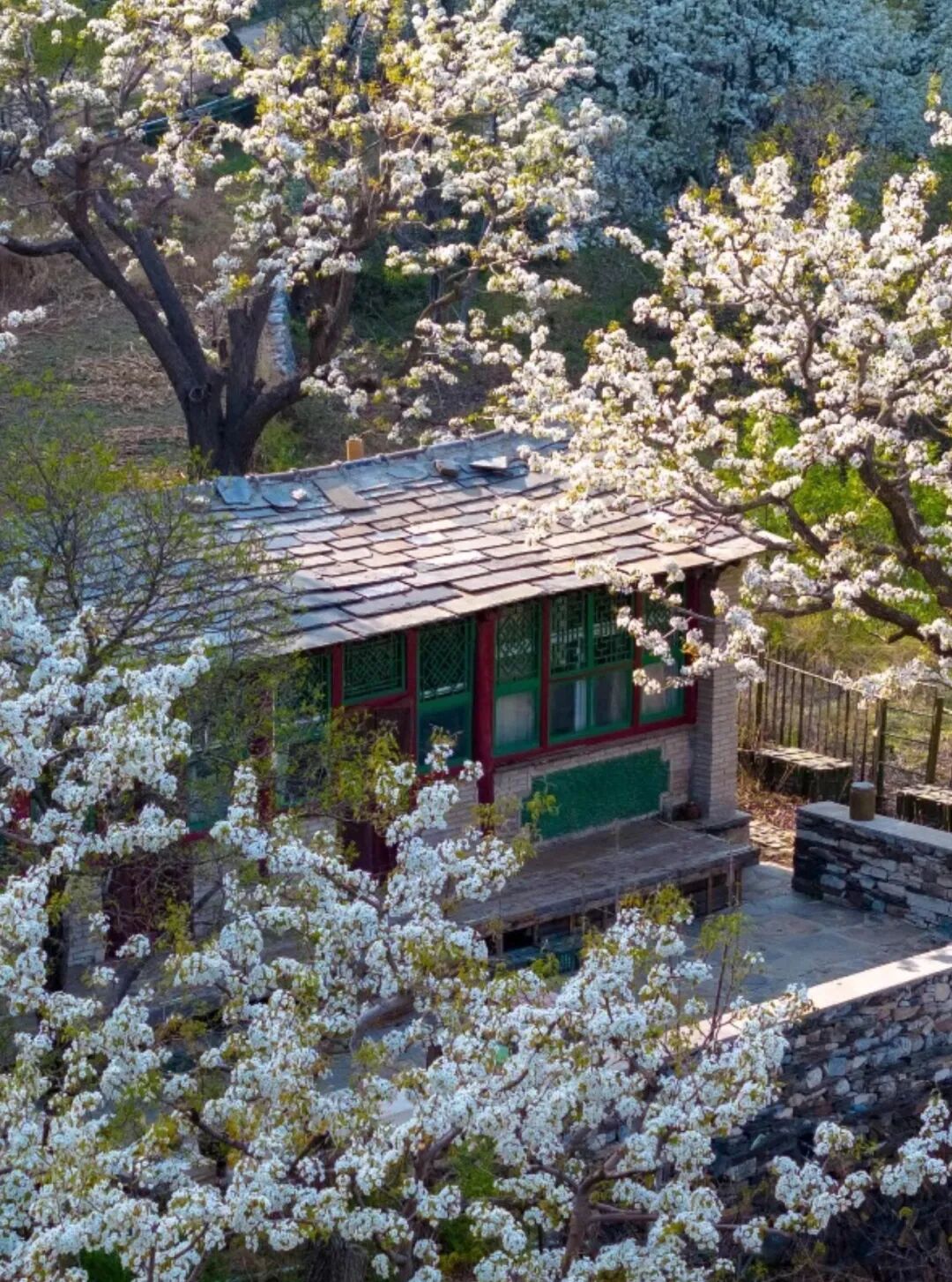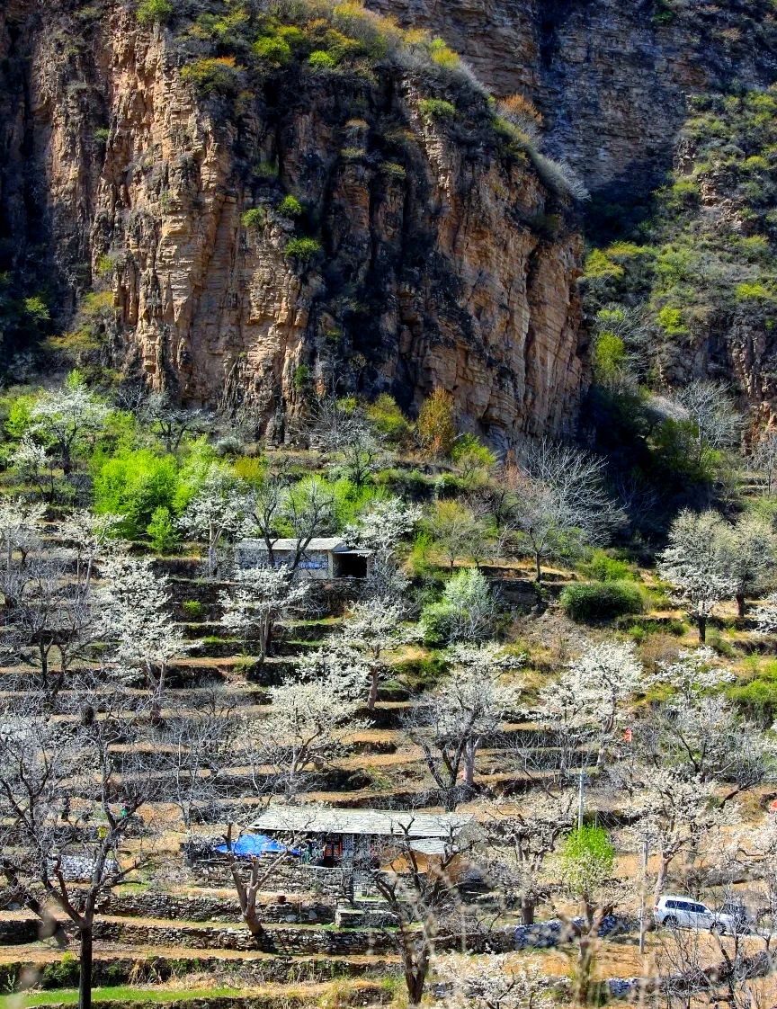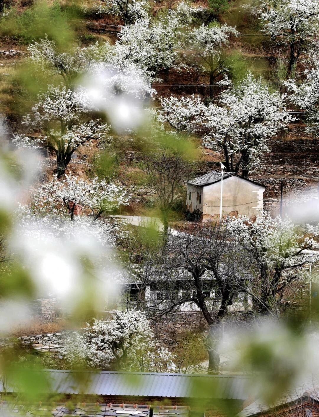大滩村位于北京房山霞云岭,四周高山环抱,中间谷地狭窄,这里远离喧嚣,空气清新。这个京西大山深处的偏僻山村,梯田种满有千树梨花,美如仙境,与世隔绝,遗世独立,一片古老而原始的神韵。大滩村最美的就是梯田、梨花、老屋和石板路。层层梯田,依山而落,小路蜿蜒,几间自建的屋舍坐落其间,宁静安逸,待梨花盛放时节,当真是“世外桃源”了。