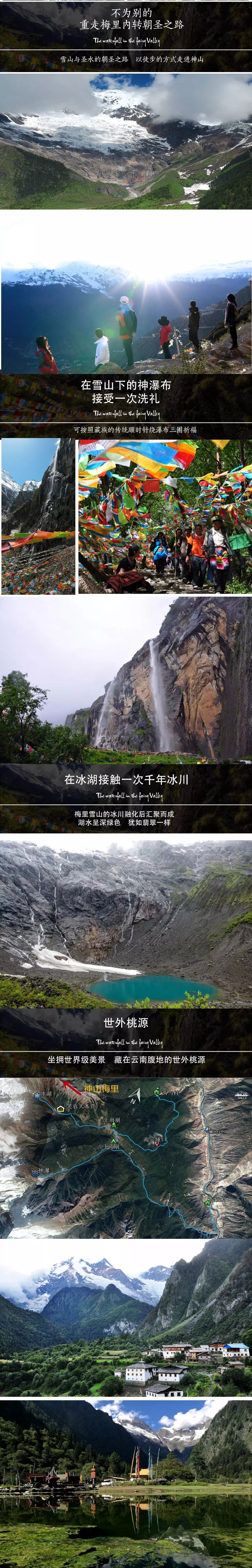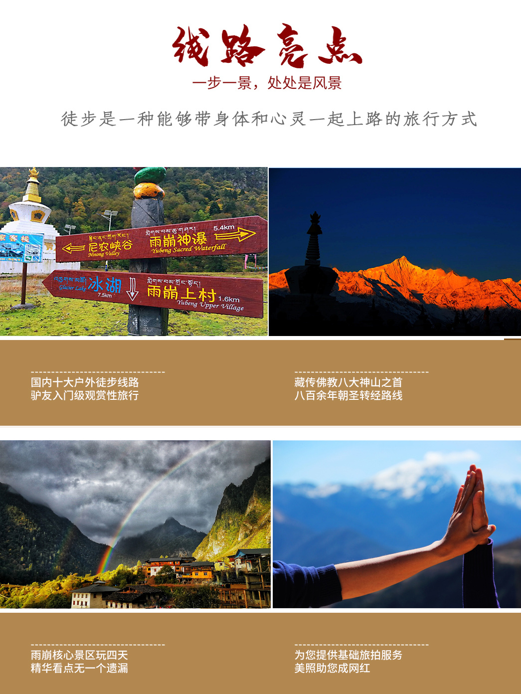 说明:此线路对体力有一定的要求,深度体验徙步,虽然前面的路会艰辛,但坚持到后面会轻松很多。先苦后甜,追寻雨崩伟岸背后那抹横空出世的冷艳温柔,也是值得的。毕竟,美好的事物总是值得用尽全力去追寻……