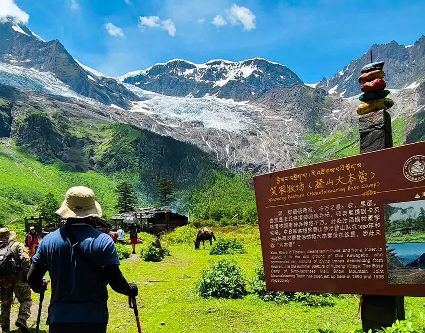 1991年中日联合登山队修建而成,是登梅里雪山卡格博峰的一个大本营,去雨崩村旅游必去的一个地方,风景优美。我们在大本营稍作休整,吃过干粮后继续向前,约1.5小时后抵达海拔3800米的冰湖,冰湖是梅里雪山冰川融化的雪水汇集而成形成的深绿的海子,被称为梅里雪山的圣湖。