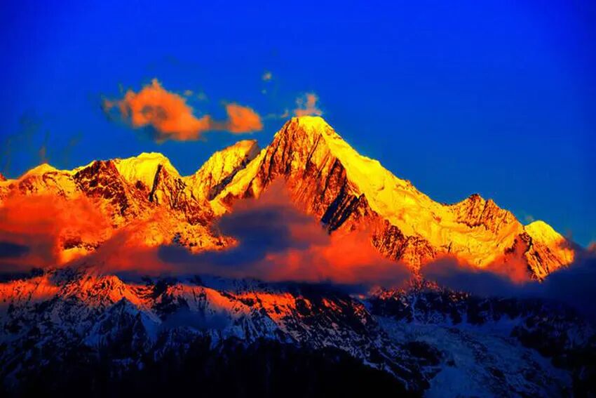 香格里拉一词在藏语意为:“心中的日月”,而日照金山正是太阳的圣洁之光照耀在卡瓦格博之巅峰,象征着藏民心中的纯洁与祝福。