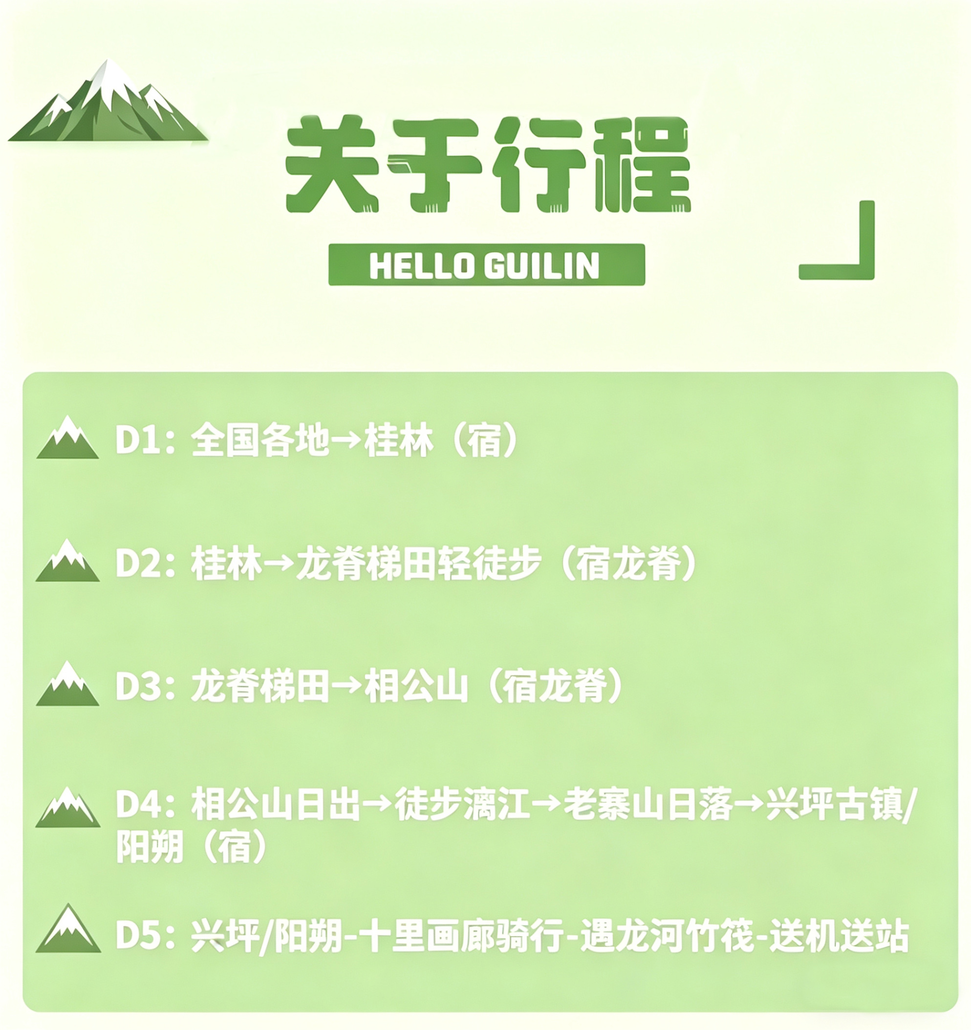 4)【景点】景点首道门票(龙脊门票加景交车、相公山门票、徒步漓江过渡费、遇龙河骑行。